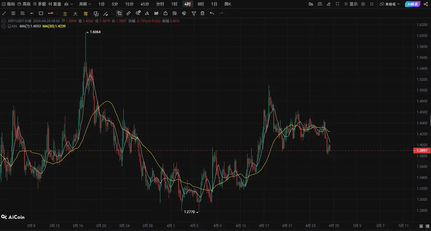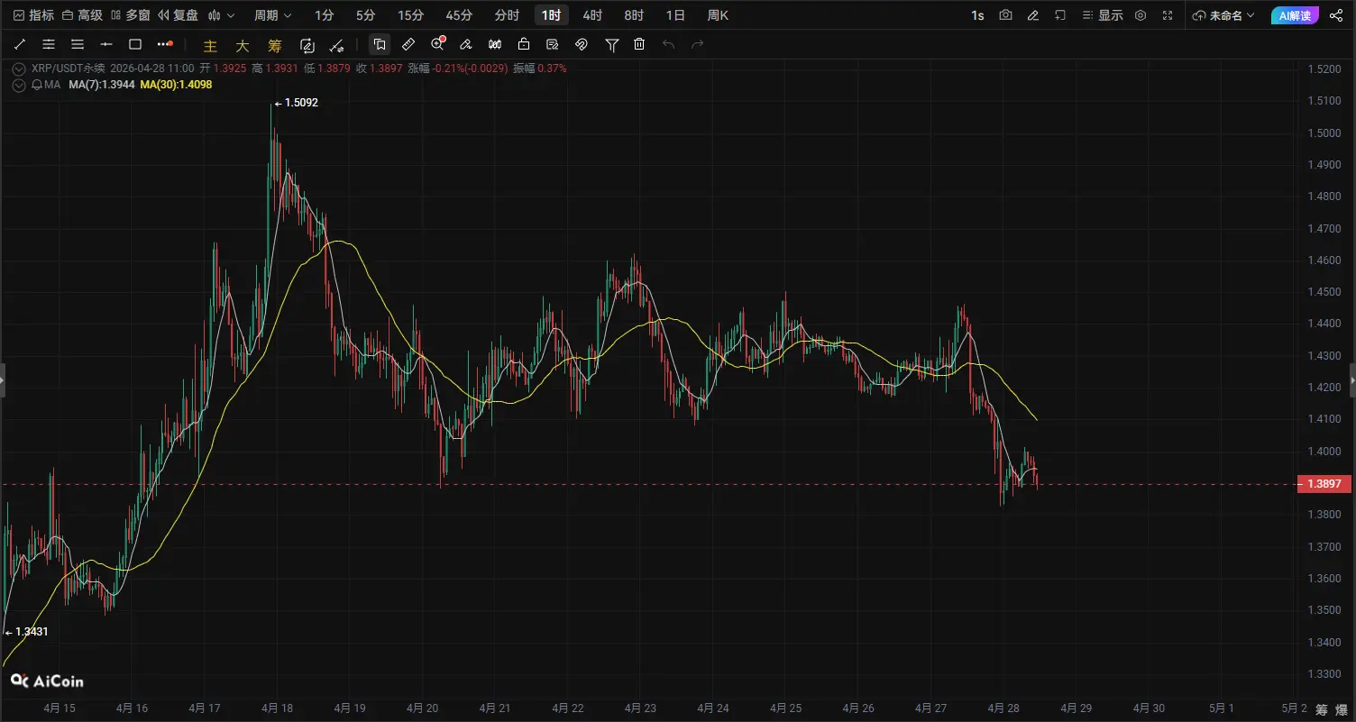 From the overall trend, after XRP rebounded from the early low of 1.11, the price gradually returned to the 1.35–1.45 range for consolidation. Recently, the trend has started to show a structure of higher lows + sideways consolidation, which usually indicates the market is in a consolidation phase building a bottom.