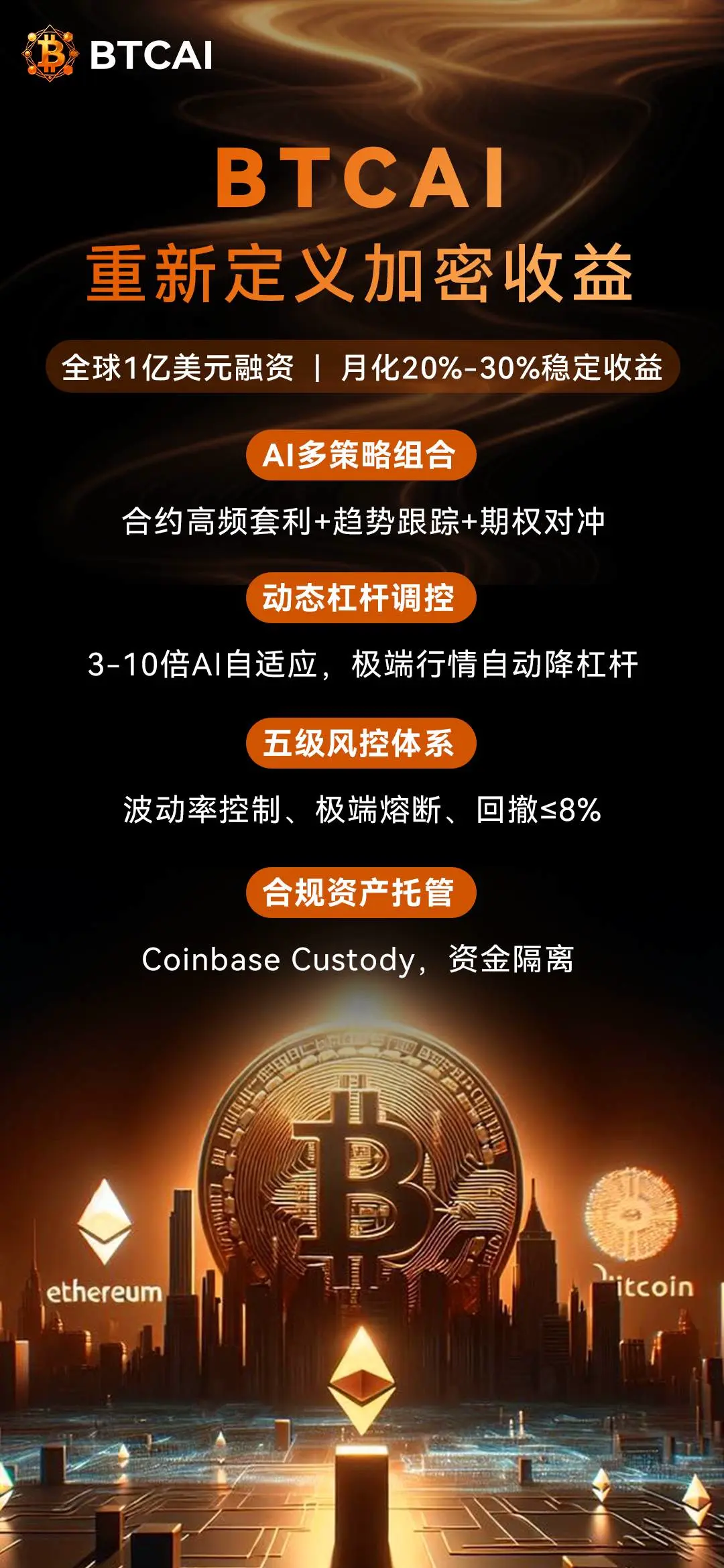 产品端形成双矩阵:面向机构的BTC/ETH 高收益基金(月化 20%-25%)与多策略增强基金(月化 25%-30%),AI 动态调节 3-10 倍杠杆;面向 B 端输出AI 量化 SaaS 与 API 策略服务,赋能中小资管与交易所,构建技术生态。