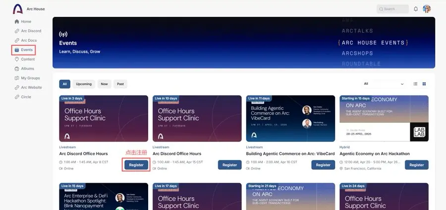 Paso cinco: hacer clic en la página “Events” a la izquierda y registrar todas las actividades en las que puedas inscribirte.