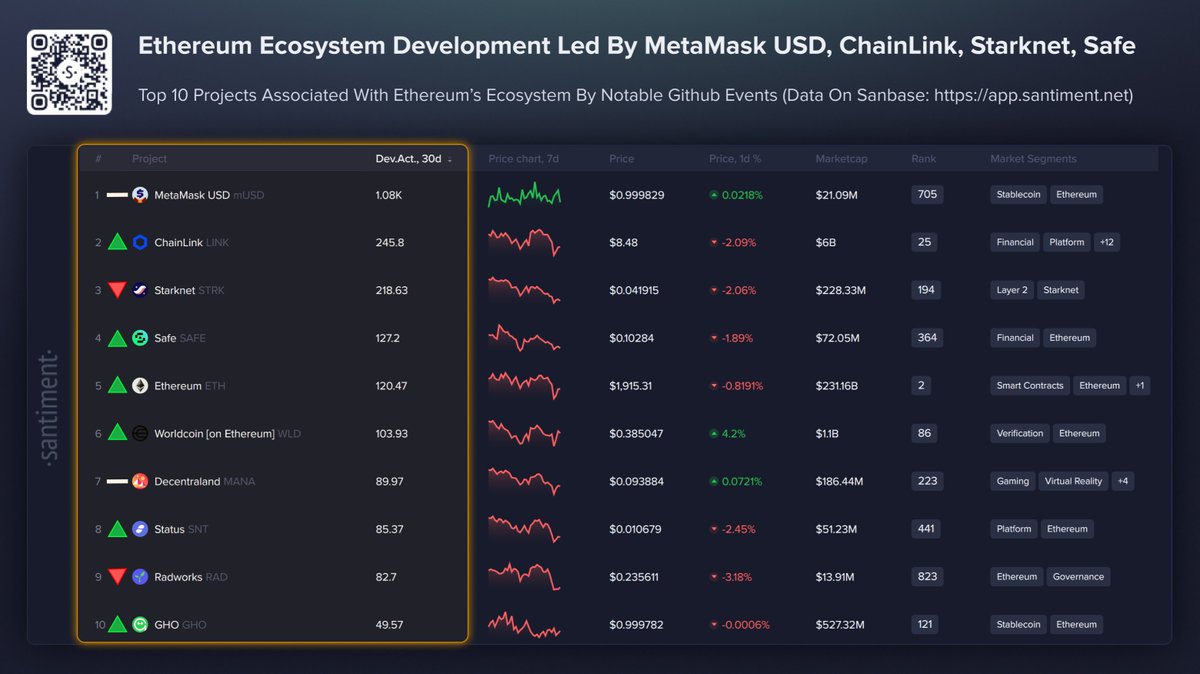 MetaMask USD memimpin peringkat dengan skor aktivitas pengembangan 30 hari tertinggi, disusul oleh Chainlink dan Starknet. Ethereum sendiri berada di peringkat kelima dalam daftar.