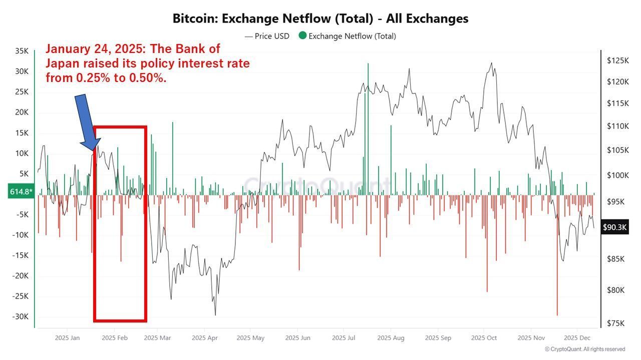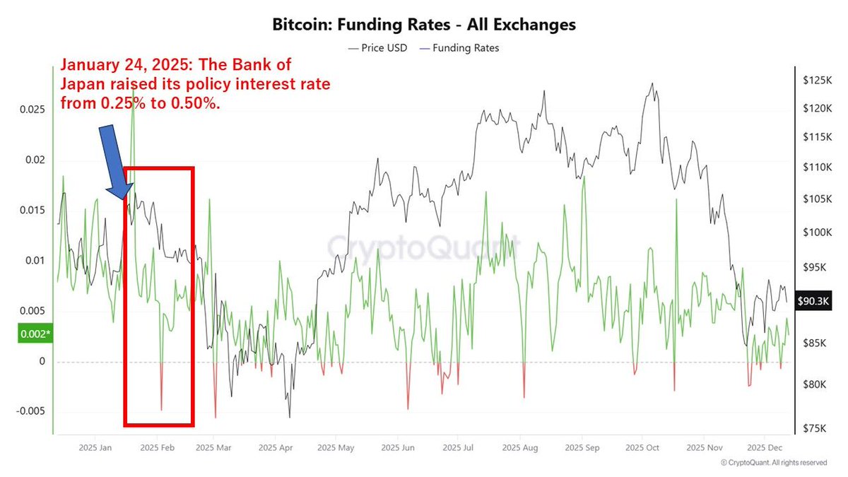 - 広告 -* * * * * 今週のビットコインの値動きが荒かったのは、思いつきのように突然起きたわけではありません。CryptosRusによると、この混乱は1つのマクロ変数に結びついています。日本銀行が超緩和の金融政策から段階的に離脱していることです。この変化は、ビットコインを含むリスク資産に対して短期的な向かい風を生み出していますが、根底にあるトレンドはなお維持されています。### 今年の前半に見られたおなじみのパターン私たちはすでに、日銀が政策を調整すると市場がどう反応するかを見ています。2025年1月24日、日本は金利を0.25%から0.50%へ引き上げました。ビットコインは予測可能な一連の流れで反応しました:* BTCは取引所へ移動し、パニックというよりポジショニングを示しました。 * フィンディング・レートが低下し、システム内の過剰レバレッジが吐き出されました。 * 価格は押し戻されましたが、重要なのは長期の構造が崩れていないことです。その瞬間はマクロのストレステストとして機能し、そしてビットコインは合格しました。 ### それから十五年後:サトシ・ナカモトの最後の公開登場を思い出す ### なぜ同じセットアップが再び起きているのか今日の環境は、あの1月の出来事とほぼまったく同じです。日本円が強まるにつれて、キャリートレードは巻き戻し(アンワインド)を始め、世界の市場におけるレバレッジのかかったポジションをリセットせざるを得なくします。影響は素早く波及します:* 円高=ポジショニングの組み替え * レバレッジが取り崩される * 暗号資産全体で短期のボラティリティが急上昇 この動きは恐怖によるものではありません。日本が政策正常化に向けた緩やかな動きを示すことで、マクロの参加者がリスクを調整し直しているだけです。### パニックではなくポジショニングCryptosRusは、これは弱気のマクロ転換ではなく、単にノイズを説明するものだと強調しています。直近の引き上げの際には、ボラティリティは概ね織り込まれており、レバレッジが正常化すると、ビットコインは自然に安定しました。結論は明確です:マクロの背景がビットコインに敵対しようとしているわけではありません。トレンドが再開する前に、単にレバレッジがはがれていくだけです。