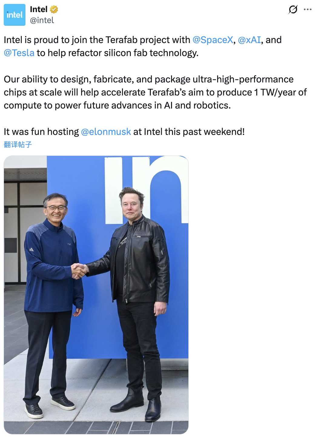 Intel hôm thứ Ba đã công bố hợp tác nói trên trên nền tảng truyền thông xã hội X.com do Musk sở hữu, đồng thời tiết lộ rằng sẽ hợp tác với SpaceX, Tesla và công ty trí tuệ nhân tạo của Musk là xAI.